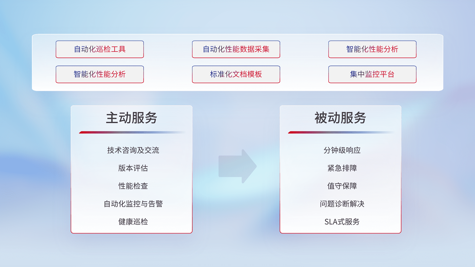 智能化工具和标准化文档,,,,保障服务质量,,,,提供主动服务(包含技术咨询、、、、版本评估、、、性能检查、、、自动化监控与告警、、、、健康巡检)和被动服务包含(分钟级响应、、、紧急排障、、值守保障、、、、问题诊断解决、、SLA服务)。。。